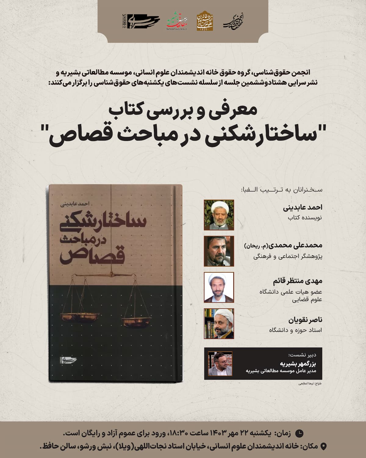 انجمن حقوق شناسی، گروه حقوق خانه اندیشمندان علوم انسانی، موسسه مطالعاتی بشیریه و نشر سرایی هشتاد و ششمین جلسه از سلسله نشستهای یکشنبههای حقوق شناسی را برگزار میکنند:
