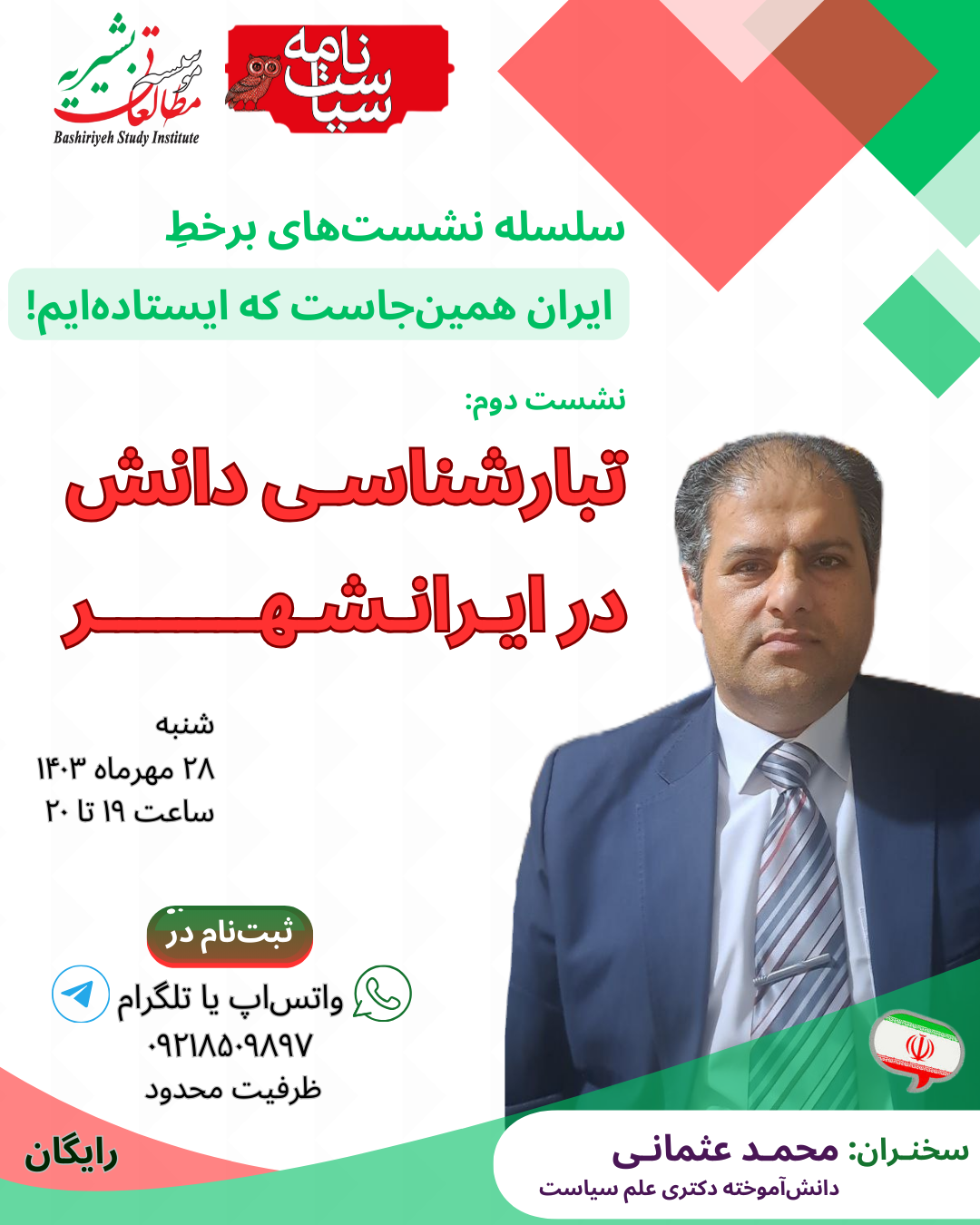 «ایران همینجاست که ایستادهایم» عنوان عام سلسله نشستهایی برخط است که با همکاری مجله سیاست نامه و موسسه مطالعاتی بشیریه برگزار میشود. نشست دوم این مجموعه با سخنرانی دکتر محمد عثمانی و با عنوان «تبارشناسی دانش در ایرانشهر» ساعت ۱۹ روز شنبه ۲۸ مهرماه ۱۴۰۳ برگزار خواهد شد.